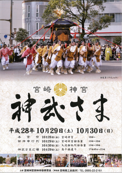 宮崎神宮御神幸祭は、明治9年(1876年)から約140年の歴史を誇る宮崎県を代表する祭りです。「御神幸祭」は、「神武さま」と呼ばれ、秋の宮崎を彩る県下最大の大祭として、県民の多くに親しまされています。