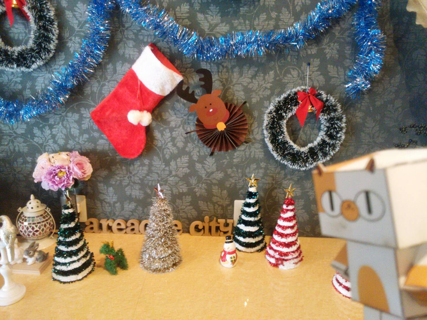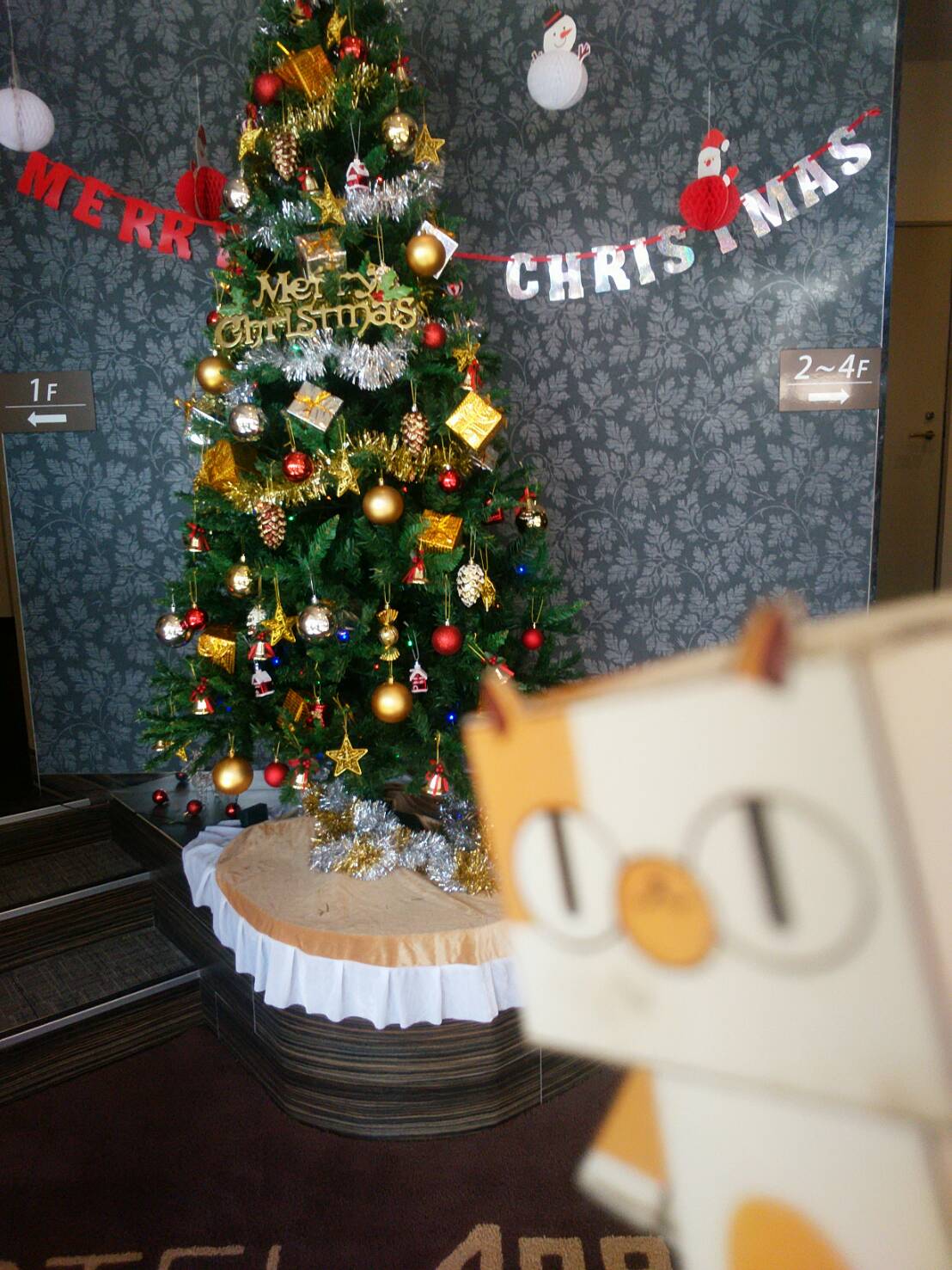 まず、玄関入ってドーン!!っと目にはいってくるのが、高さが2メートルを超える大木(猫目線)にゃ~。なんだか綺麗な物がいっぱいついているニャー。