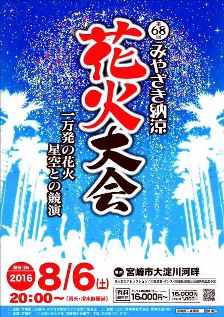 宮崎市の夏の風物詩として親しまれている「みやざき納涼花火大会」が今年も開催されます。打ち上げ花火やスターマインなど約10,000発を打ち上げるほか大型仕掛け花火(ナイアガラ)などもご覧いた だけます。夏のひとときを、最高のポイントで迫力満点の花火を観覧できる有料観覧席でぜひお楽しみください。